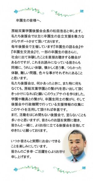 2020/5/10/ / 最終更新日時 : 2025/8/19/ koenkai-f 卒園生のみなさまへ 卒園生のみなさまへ 2 後援会会長からのメッセージ 落ち着かない日々は まだまだ続きそうです。 今の暮らしに、 これからの生活に、 もし不安を感じられたら、 一人で抱え込まず、 後援会にひと声かけてください。 後援会は、 卒園生の皆さまと、 一緒に考えていくところだからで […]